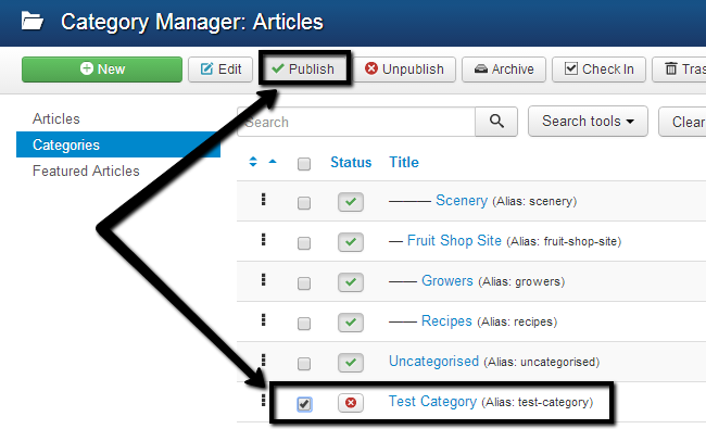 You can publish or unpublish different categories on your Joomla website in order to make them visible on your website or not.To publish a new category, go to the Category Manager, select the checkbox next to the category that you wish to publish and then click on the Publish button at the top.