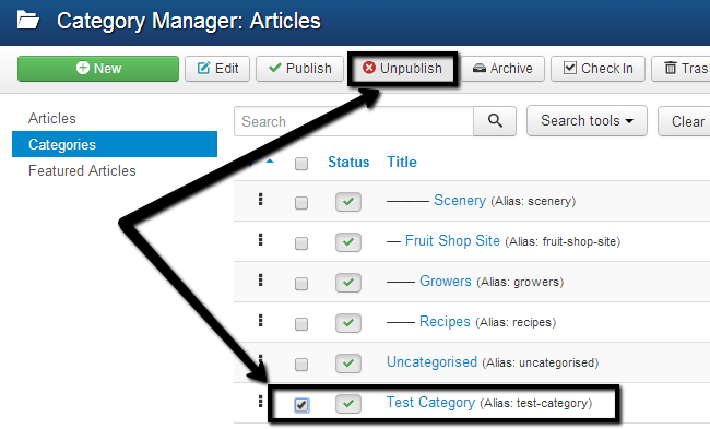 To unpublish a new category, access the Category Manager. Then select the checkbox next to the category that you wish to unpublish and click on the Unpublish button at the top.
