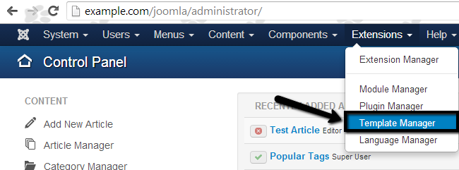 Log into your website as administrator and navigate to the Extensions tab on the top menu, then to Template Manager.