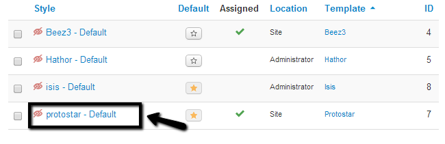 First, click on the name of the template that is currently enabled on you website. In our case, this is the default Protostar template.