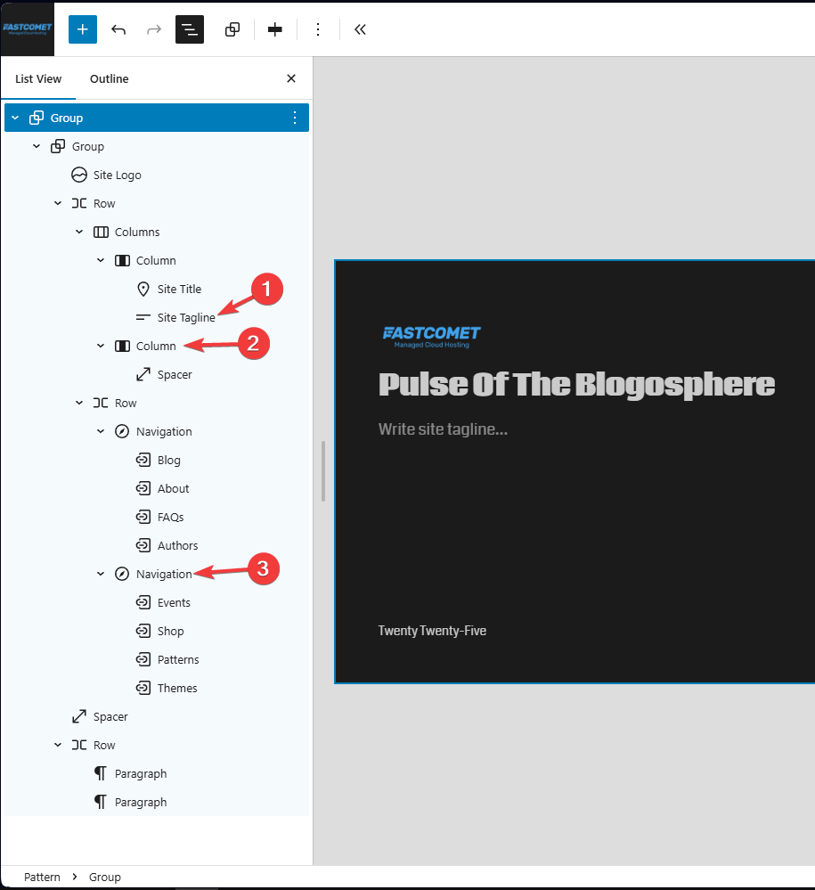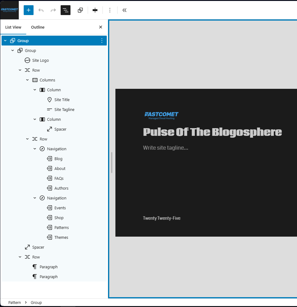 Those are a lot of blocks, but they are super easy to understand. Even better, you can drag and drop blocks in that list, which will change where they lie on the page, giving you full freedom over the pattern layout. So, let us edit this footer to show how easily it can be transformed. Let us begin with removing some blocks we will not need.