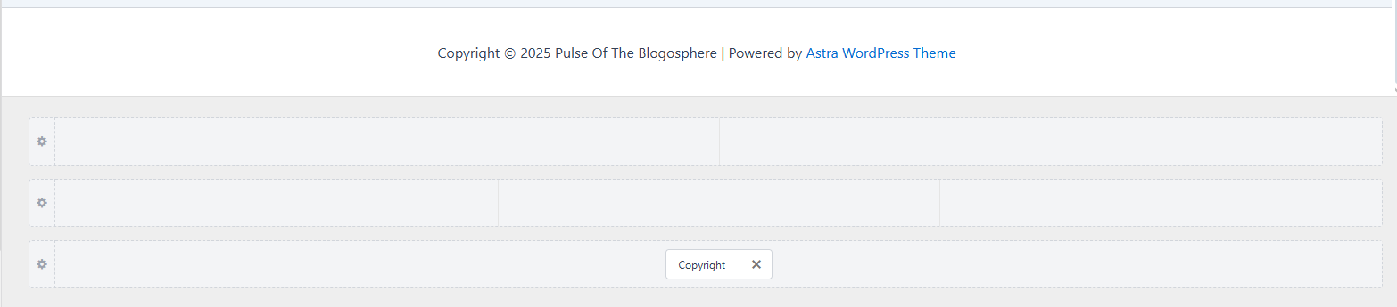 You will also notice in the screenshot previous to the last there is a Copyright element in the third footer (the below footer). So, let us add something above it. We do not want the copyright to be on top of our actual footer. Doing so is really easy, but let us set up our footer slot first. Click on the cogwheel next to the middle one and change it to three columns. We will also change the inner elements layout to inline and the vertical alignment to “middle.”