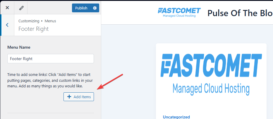 Click it to open the options on the left and then Configure Menu From Here. At the bottom of the list, you will see Footer Menu, but there should be nothing in the drop-down list. Click +Create New Menu. Assign it a name and ensure that Footer Menu is ticked. Then, we can add some items.