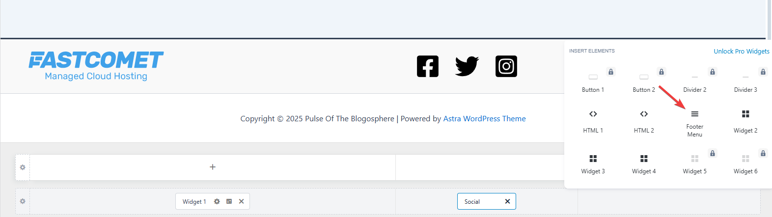 Then, hovering over the footer, you will see plus signs appear. Click on the left one so we can add our site logo there. Add a widget from the small window that will pop up.