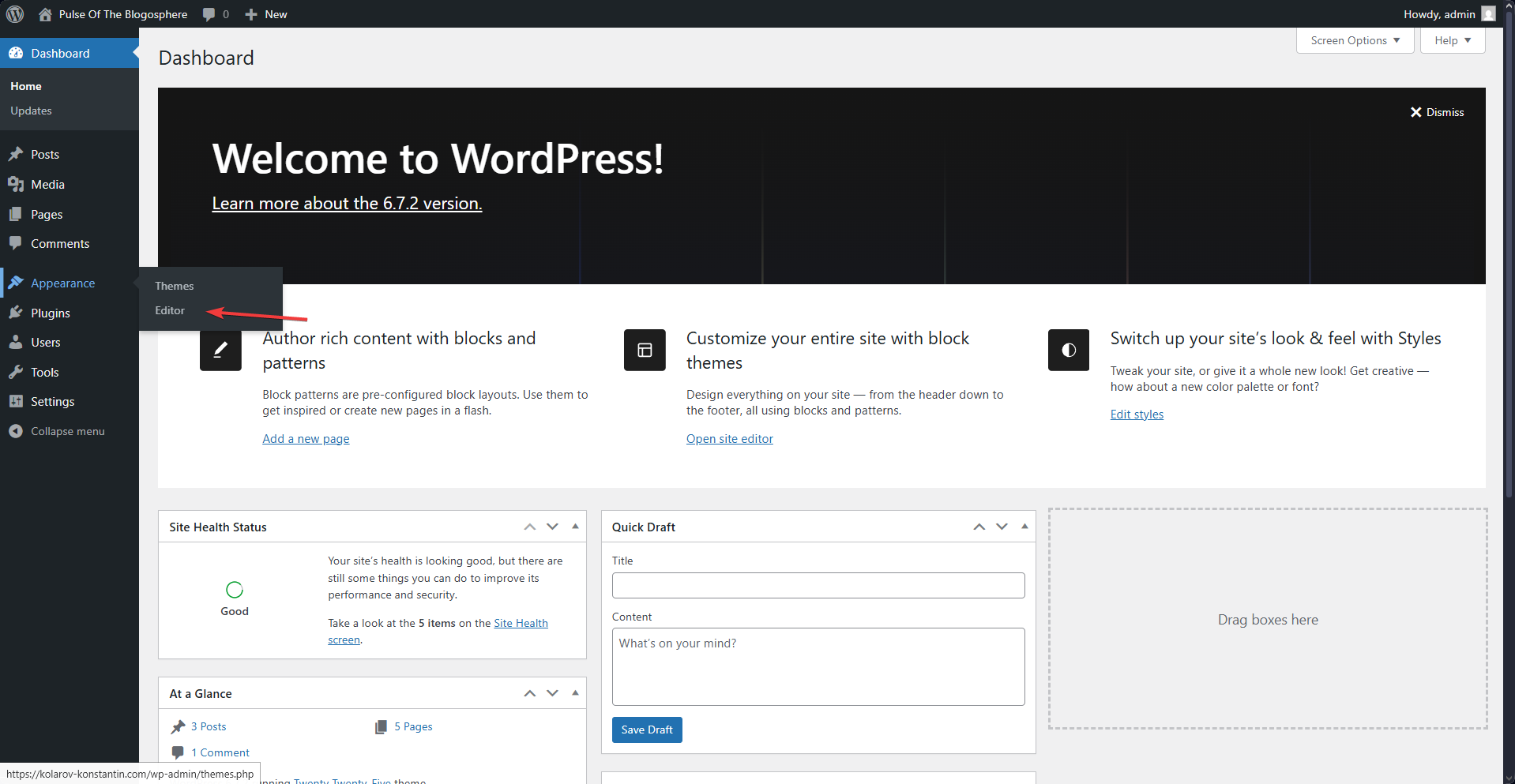 To begin, go to your WordPress dashboard and look for the Appearance section in the menu on the left. Hover over it, and the Themes and Editor subcategories will appear. Click on Editor.
