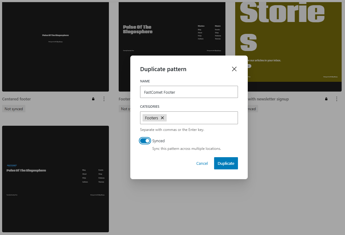 A window will pop up, so simply fill in the fields. Name your new pattern and assign it a category (Footers in our case). We recommend toggling it Synced. This will make it so that anytime you change this pattern in the Editor or in any of the pages it is in, those changes will apply throughout the website. Since this is a footer, a static element of our website, we want it to be consistent throughout the website. When ready, click Duplicate.