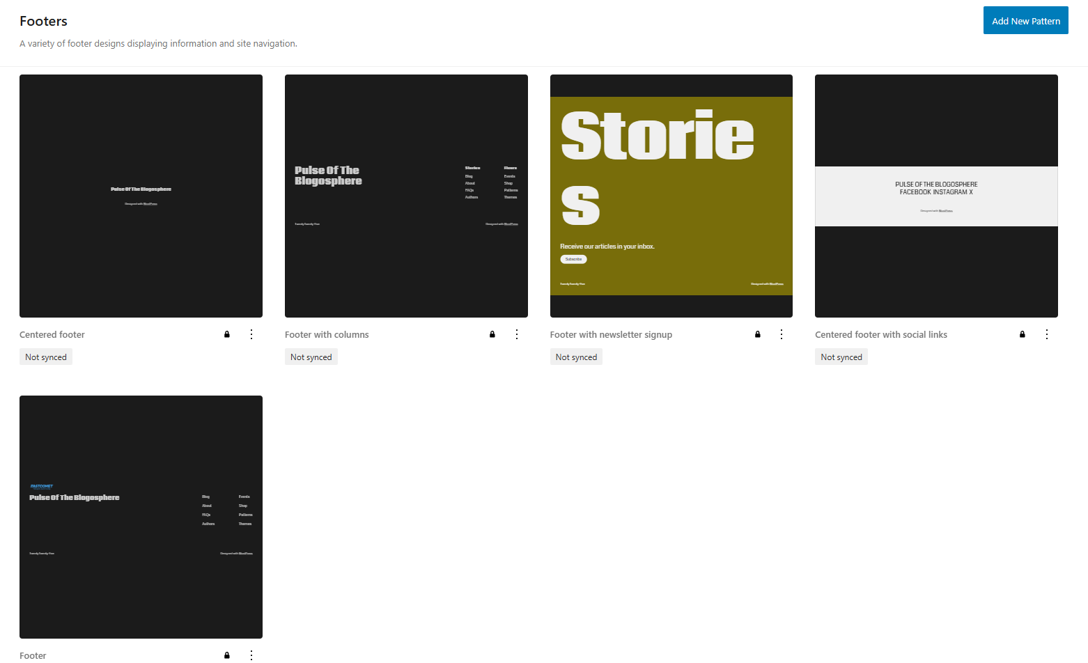 For our purposes, we will solely use the Footer patterns. The theme has five, each with a different layout that should be perfect for most websites. Not only that, but they are highly customizable. So, let us begin!