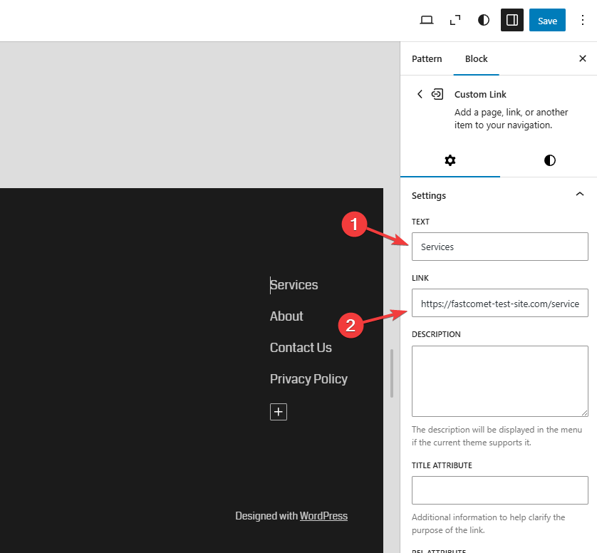 The last thing we want to change is the links in the navigation bar on the right. That is done just as easily as adding the URLs to the social icons. Simply clicking on the links under the Row block in the list opens their options on the right side of the screen. There, you can change what the text says and where the link leads.