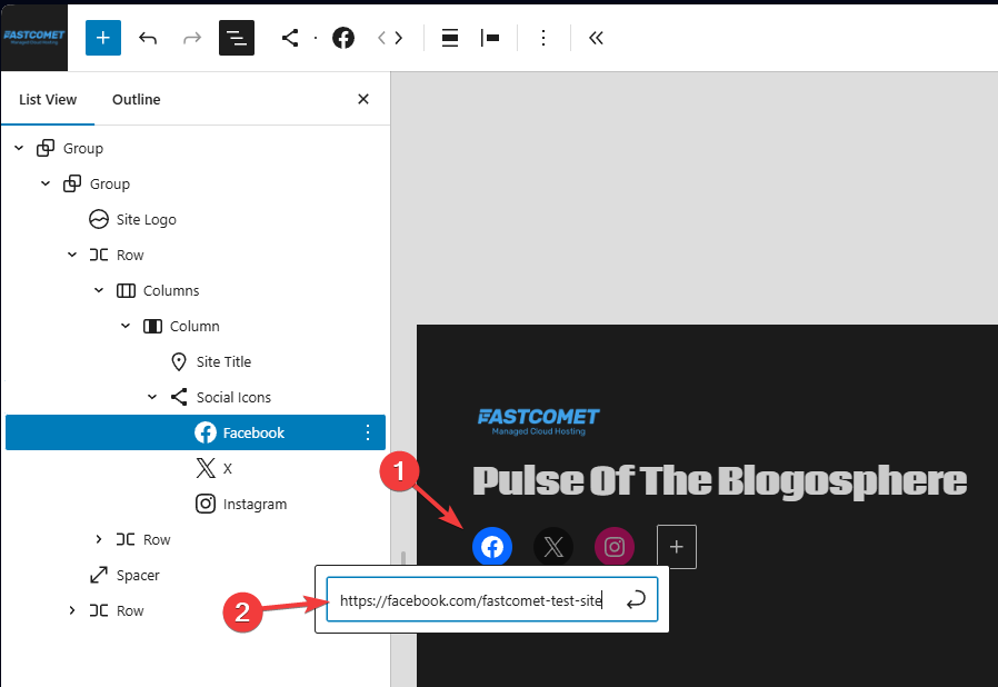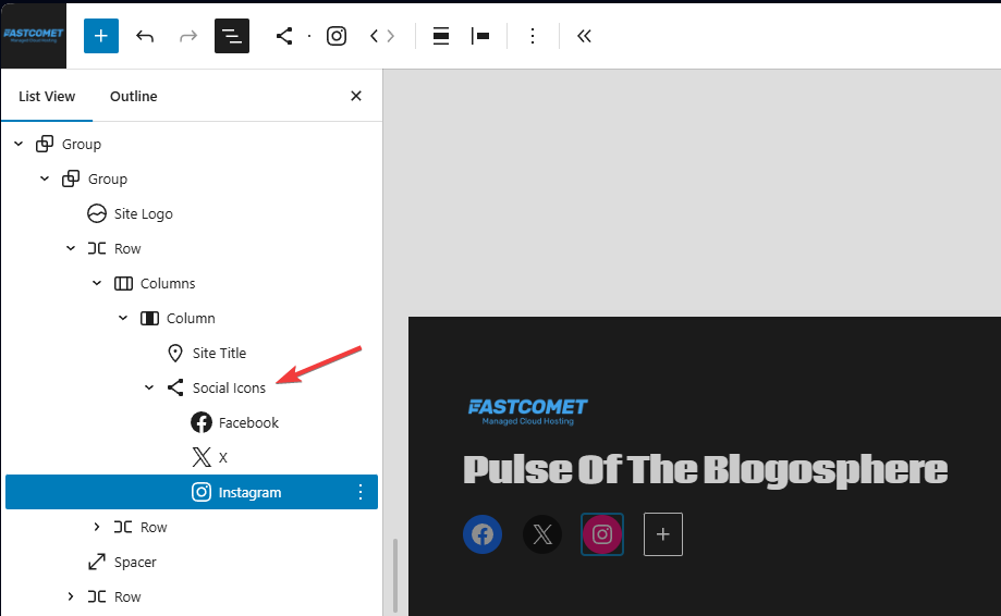 Clicking it will open a small window to search for blocks—type in your favorite social media platforms. We will keep it simple and add The Big Three. However, you will notice that the block is in the middle of nowhere. This is perfect because it allows us to showcase what we mentioned earlier. Simply drag the block to the position you want in the list on the left. We want it to be directly under our site title, so that is where we will put it.