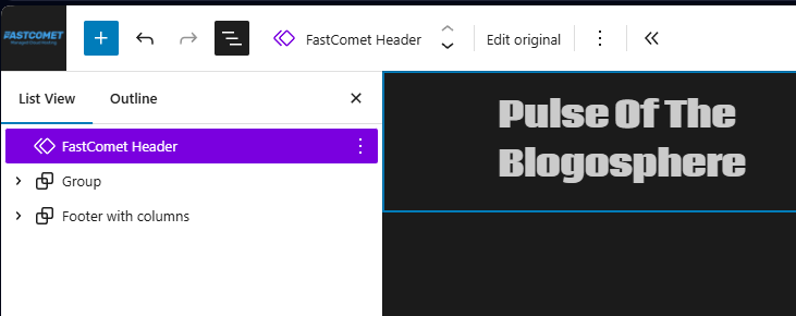 Click on the three dots again and then Edit. This will open the WordPress editor, where we can make all our desired changes. On the left, you will see a list of all the blocks that currently make up this pattern. Here is what it looks like by default, with all categories expanded.