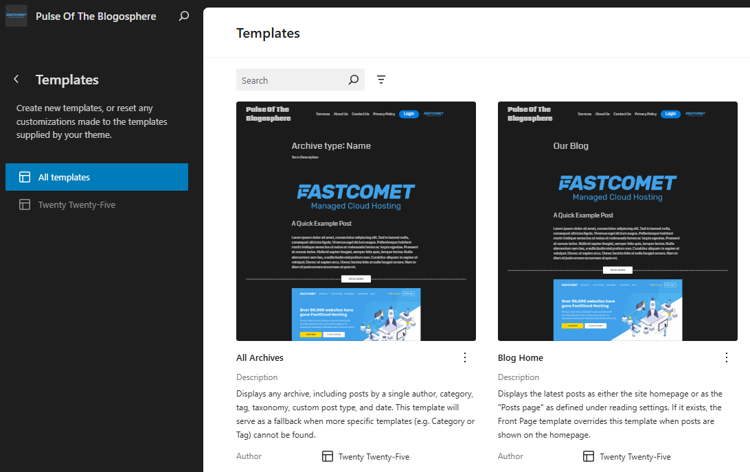 The Twenty Twenty-five theme we will use for our tutorial is a minimalistic but incredibly robust and customizable theme that is perfect for beginners and advanced users. It offers all the tools necessary to create a great-looking website with ease. It comes with several crucial styles, patterns, and templates that cover core pages (homepage, post page, etc.) and page elements (header, footer, etc.).
