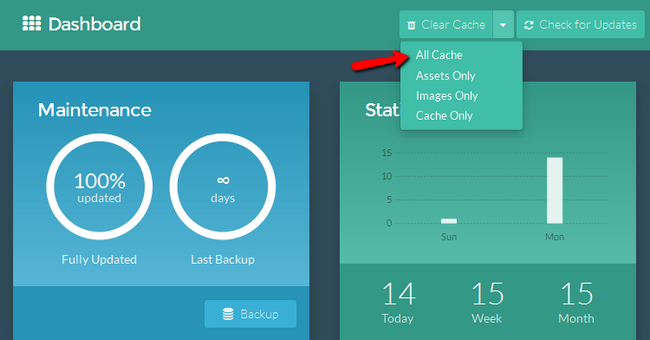 Unlike other applications where it is hard to find the clear cache option and you have to look under every tab in the configuration and settings menus, in Grav the Clear Cache button is right on top of the admin dashboard screen.