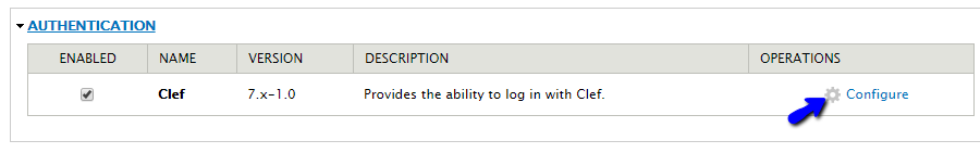Locate the Authentication section and check the Enabled check-box, next to the Clef plugin. Click on the Save Configuration button to enable the module.