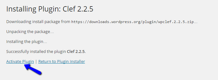The system will automatically complete the Clef installation on your WordPress website. Click on the Activate Plugin button on the next page to enable it on your website.