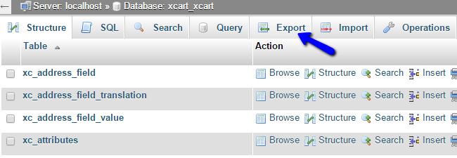 You will see a list of all tables on your database. To proceed with the backup creation, click on the Export button at the top menu
