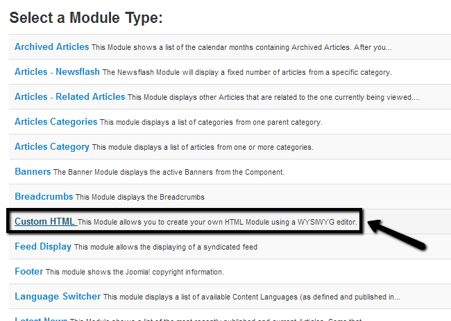 Select the Custom HTML module type from the list.