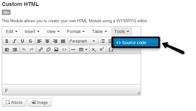 In the Custom HTML section, click on Tools > Source Code.