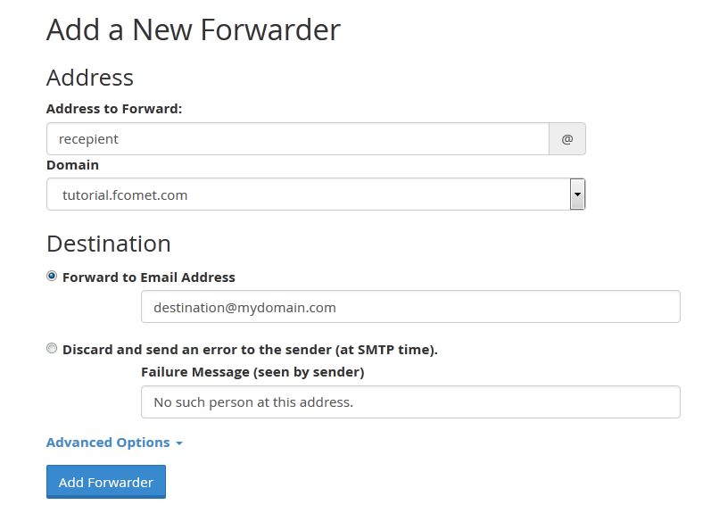 To create your first forwarder simply click on the Add Forwarder button. Next, input the name of the email account that will be forwarded and the destination email address to which your emails will be directed.