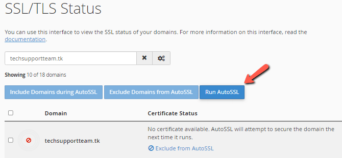 Not having an SSL certificate installed is elementary to fix, though, since all that needs to be done is click on the No Certificate itself. That will take you to the SSL/TLS Status page of your cPanel. On this page, you will see all the domains currently added to cPanel, and the ones that don't have an SSL certificate will have a red circle next to them. Click on Run AutoSSL to issue certificates to them.