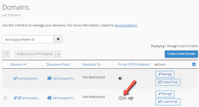 Then, find the subdomain which is associated with your actual domain and turn on the HTTPS redirect.