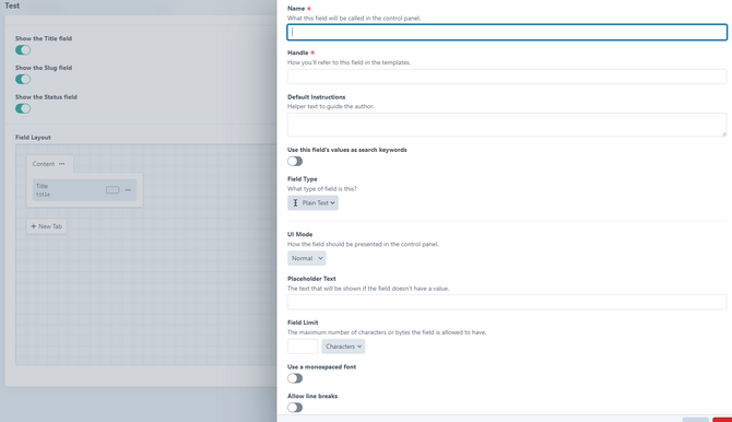 - Field Layout - Here, you can tinker with the order and arrangement of your fields. This arrangement will only appear in the dashboard and not the finished page. That is accomplished via the code in your template. You can also create entirely new fields, too.