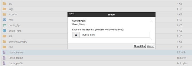 When you open it you will see the cPanel File Manager interface. On the left side of your screen you will see the directory tree of your hosting account and on the right side will be the content of your current folder. Additionally, you will see your home directory. In cPanel it is usually /home/username where username is replaced with the actual name of that cPanel account. Keep in mind that that entire path (/home/username) is your "home" (root directory). So, when moving or copying files, all you need is a slash ( / ) to start your path. Here is an example with moving a file to the public_html directory that is in the "home".