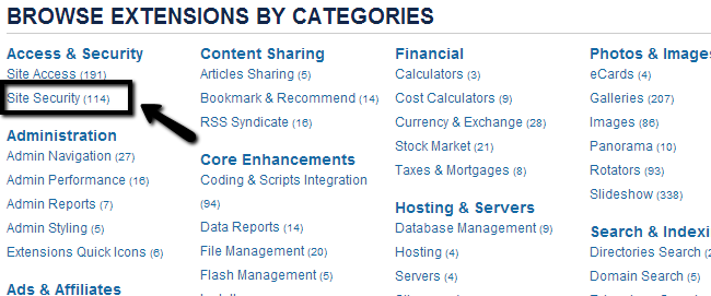 Click on All Categories to browse a list of all categories with extensions supported by Joomla. For the purpose of this tutorial, we will download the Admin Tools extension. So simply locate the Access and Security category and select the Site Security category.
