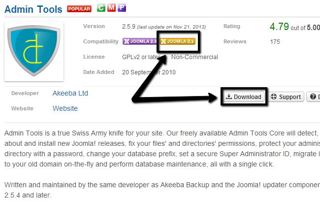 When you select the extension that you wish to download, you can review all information about it. There is a summary about the extension providing more details on what it does, the Joomla versions it is compatible with, Reviews, etc. Make sure that the extension is compatible with the Joomla 3.x release.