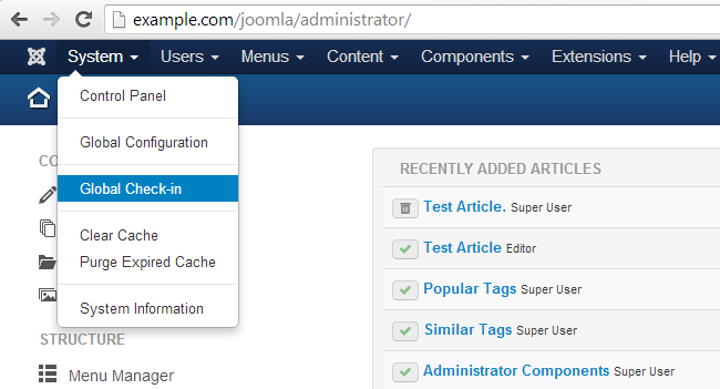 To do that, you need to log into your website as administrator. Navigate to the System tab and then Global Check-in.