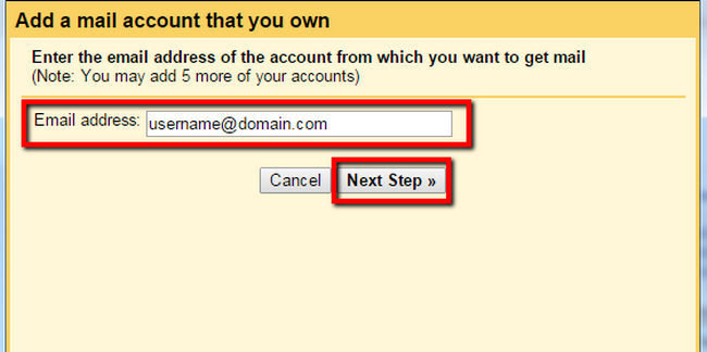 On the pop-up window you should type the full email address of the account you want to access via Gmail, for example [email protected] instead of just the username. Also notice that instead of [email protected] you should type the actual email credential. After the email field is filled, press the Next Step button.