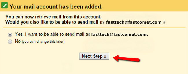 After all of the options are set correctly you will receive "Your mail account has been added" message and you will be asked if you want to be able to send email with your domain name email address, select that option and click on the Next Step button.
