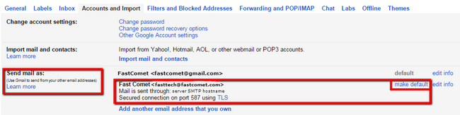 The final step after the verification is to access the cogwheel icon and select the Accounts and Import tab again. In the mentioned tab notice the "Send Mail As" section, click on the make default link next to the email address you have just set. Please notice that if you miss this step you will still be sending email from your Gmail address.