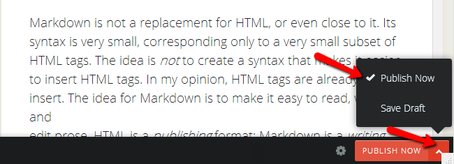 When you are ready with your Post title and your Post content, please click on the small arrow on the bottom right corner on your screen. From the drop down menu, please change your post status from Save Draft to Publish Now and press the red Publish Now button.