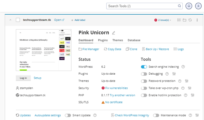 This tab will let you edit your website's database information: its Name, Table Prefix, Username, and Password. You can assign any values you wish here. Still, one thing must be noted: the database name and username will always begin with your cPanel username. You can see in the screenshot above that, in our case, the username is always in front of the fields for the database name and username. Again, clicking on the eye next to the password will reveal it if you want to note it somewhere. Aside from these settings, you do not need to do anything else regarding the database. The WP Toolkit will create the database itself and then configure it to work with the website: you don't have to bother making it manually or assigning it to the website. The Toolkit handles all of that.
