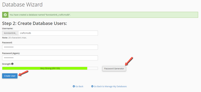 In the next step, give the user a name and a password. The password generator can create a strong one for you. For simplicity's sake, we will give the user the same name as the database itself. When ready, click Create User.