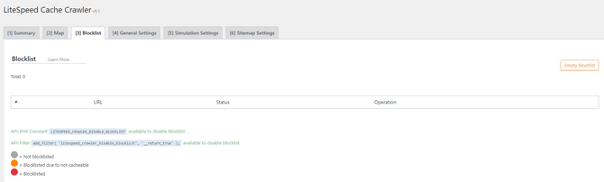 This tab will display any URIs currently blocked. Here, you can also manually remove entries from the blocklist. Once more, the status of each entry is depicted by colored dots, with a legend at the bottom of the page. Finally, the Empty Blocklist button will purge all entries from the list in case you want to start from scratch.