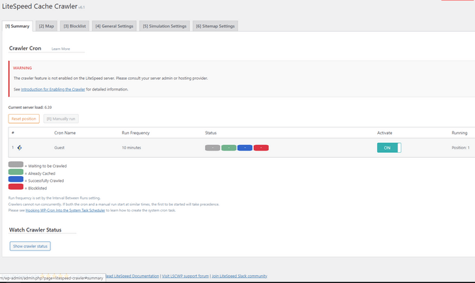 The LiteSpeed Cache plugin for WordPress comes with its own crawler. It scans your website and refreshes any expired pages in the cache. That way, your visitors are far less likely to be served outdated content. The crawler itself must be enabled on a server or virtual host level, as it can consume considerable resources. Since it is a Shared Hosting plan, FastCloud Extra does not support this feature. Still, it can be easily enabled on any of our VPS or DS solutions where LiteSpeed has been purchased. There are several tabs, so let’s look at them quickly.