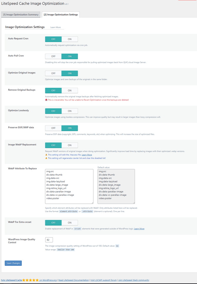 - WordPress Image Quality Control - You can set the compression quality here. Any number under 100 is fine, but the default 82 is perfect since the lower the number, the more noticeable the compression will be.