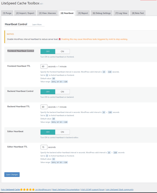Next up is the Heartbeat tab, which is a bit more important than the rest. Here, you can control WordPress’s heartbeat. We strongly recommend testing these settings before committing to them. While they can reduce CPU load, they can also interrupt WordPress tasks triggered by AJAX. Here is what each of the options does.