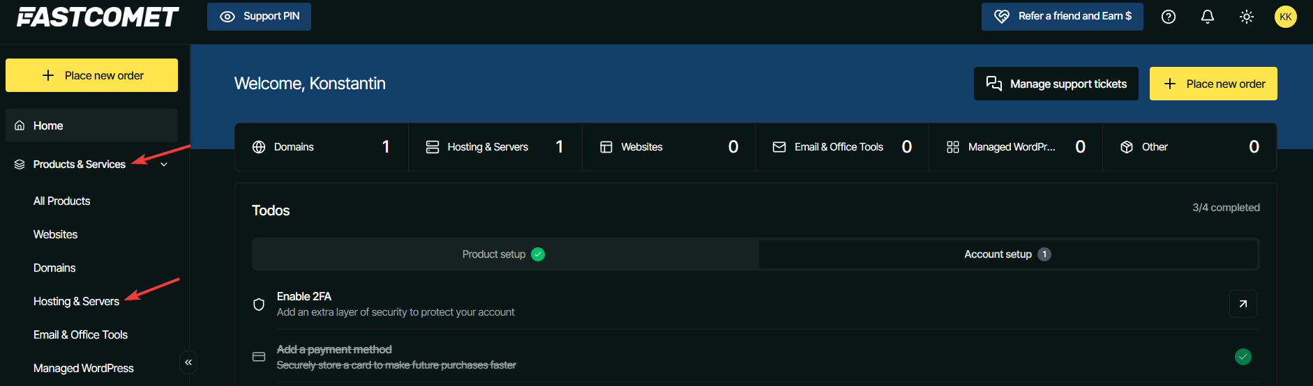 Alternatively, you can log in your Client Area and click on Products & Services > Hosting & Servers in the menu on the left.