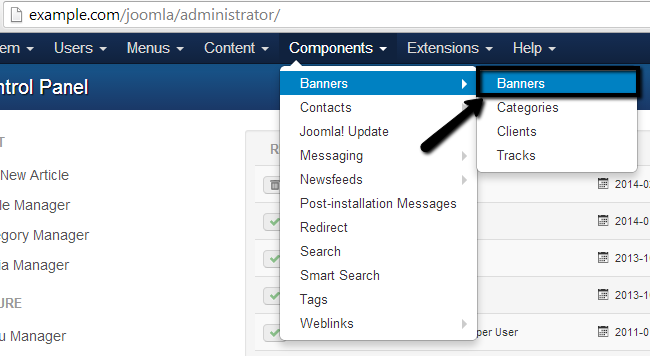 Now that you have set up a banner category and your banner client, you may proceed with the creation of your actual banner. To do so, go to the Components tab and then Banners -> Banners.