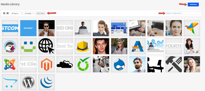 First is the Library submenu. It will show you all the images and videos you uploaded to your website. Additionally, all images that come from themes will also be available here. We will also quickly mention the available functionalities.