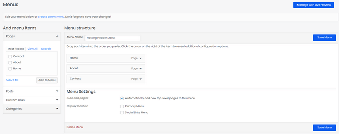 The Menus menu allows you to add items to your website’s menu structure. You can use Menus to add pages, posts, custom links, and categories to your home page. That is handy because it provides shortcuts to your most important pages, posts, etc. Here is what the Menus page looks like, and we will go over it.
