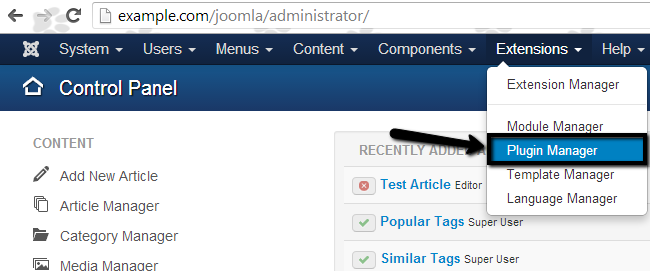 Log into your website as administrator and navigate to the Extensions button at the top menu and then Plugin Manager.