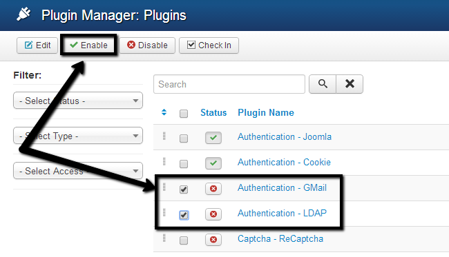 Find the plugin that you would like to enable/disable on your website and click on it’s name. For the purpose of this tutorial, we will use the Authentication - Gmail plugin