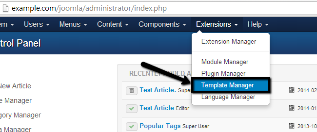 To review all of the templates on your website and select your default one, you need to log into your website as administrator. Then simply navigate to the Extensions tab from the top menu and then Template Manager.