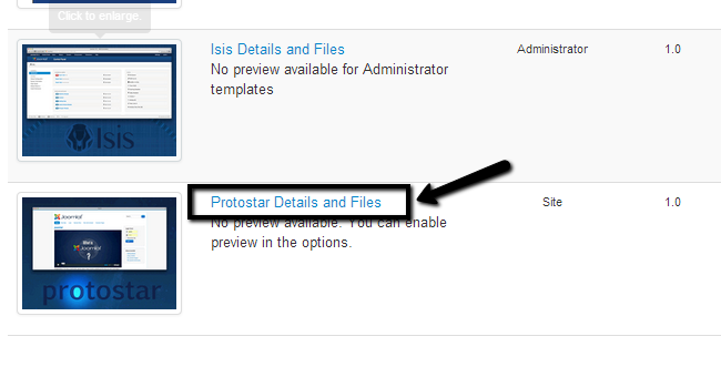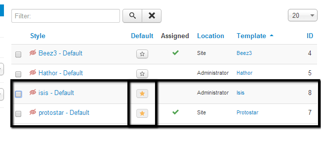 Once you access the Template Manager in Joomla, you will see a list with the available templates on your website. There are two types of templates – for the front end of your website as well as the back end. Also, the default template will be marked with a yellow star. In our case, the default templates used for the front and back end respectively are Protostar and Isis.