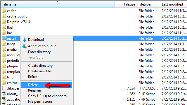 The final page will congratulate you for the successful installation of your Boonex Dolphin platform and will remind you that you will need to remove the install directory from the files for your platform. This can be achieved either via the FTP service for your account or via the File manager feature of your cPanel.
