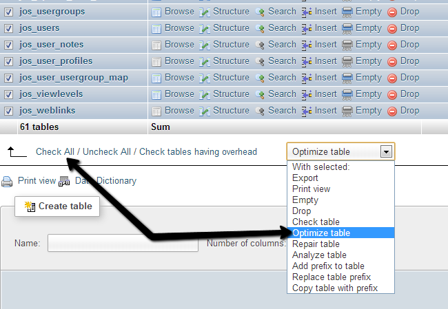 Then simply select the Optimize table option from the drop-down box.