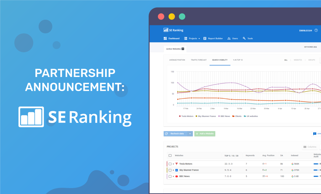 We are excited to announce that we have partnered up with SE Ranking, a web-based SEO and digital marketing software solution that gives you all the tools you need to track keyword rankings on Google. With it, you can also analyze competitors, audit your site for technical SEO needs, get a clear picture of any website’s backlink profile, and perform plenty of other SEO-related tasks for your own business or that of a client.